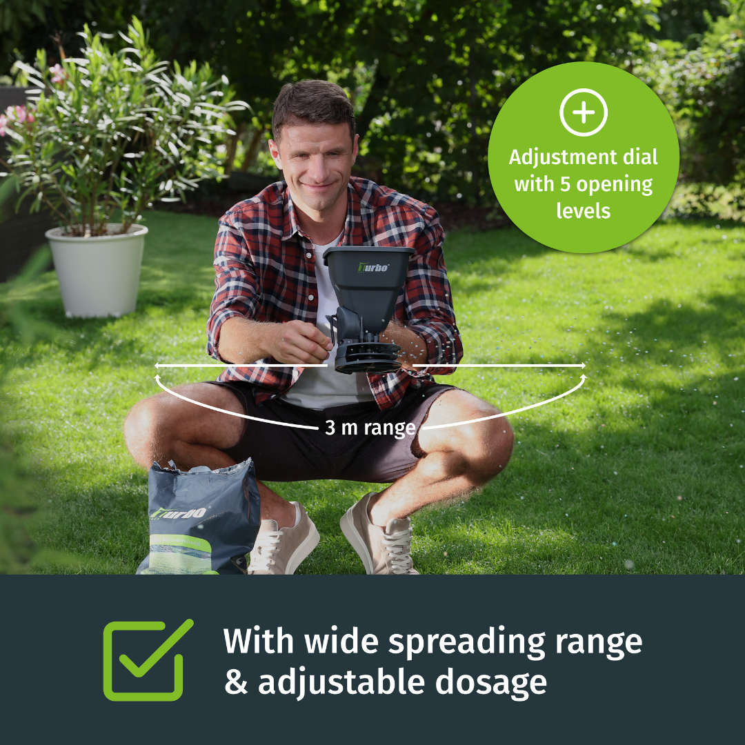 Ongelijkmatige strooipatronen en gemiste plekken in het gazon behoren tot het verleden – met de Turbogreen handstrooier. Hij zorgt voor een gelijkmatige en moeiteloze verspreiding – of het nu gaat om gazonmeststof of zaad. De nauwkeurige 5-traps dosering zorgt voor een nauwkeurige dosering en een optimaal resultaat.
